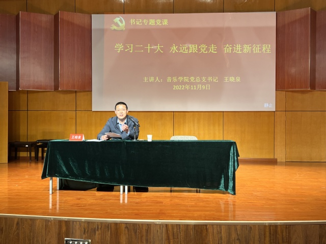 王晓泉要求同学们增强学习的主动性、自觉性,原原本本学,系统全面学,联系实际学,真正做到把思想、行动统一到党的二十大精神上来,统一到党中央决策部署上来,在以中国式现代化实现中华民族伟大复兴的伟大征程中建功立业。王晓泉深情寄语青年学子,希望大家牢记习近平总书记的教诲,响应党的号召,沿着党的二十大指引的方向前进。要坚定理想信念,站稳人民立场,厚植家国情怀,立志做一名德艺双馨的高素质艺术人才,用情用心,用歌声用琴声,用音乐作品赞美新时代,歌颂人民歌颂党。努力将个人的成长融入国家发展的洪流,不负青春、不负韶华,以梦为马、追梦远航。