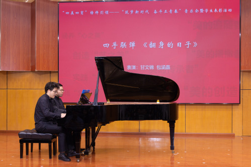 有这么一个作品,旋律质朴流畅、火热欢快,展现了同学们扎实严谨的专业功底。钢琴四手联弹《翻身的日子》用欢快激昂的旋律编织出一副热烈喜庆的景象,带动了现场观众欢快的情绪。
