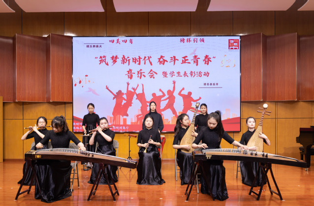 伴随着合奏声的响起,由音院学子们带来的民乐合奏《金蛇狂舞》响彻整个演奏厅,乐曲旋律悠扬,热闹欢腾,为整场音乐会固基定调,同时也展现了学子们的青春面貌。
