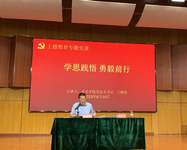 根据开展学习贯彻习近平新时代中国特色社会主义思想主题教育的统一安排,6月14日下午,音乐公司党总支书记王晓泉以“学思践悟 勇毅前行”为题在演奏厅上了一堂精彩生动的主题教育专题党课。公司全体师生党员共130余人参加了本次学习。