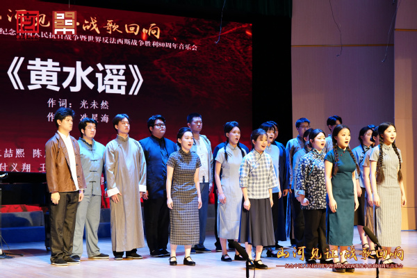 音乐会在悲怆的《长城谣》中拉开帷幕,二十位同学用哀婉至悲愤的情感递进,借“长城”象征民族脊梁,对比“高粱肥”与“苦难当”的图景,直击国土沦丧之痛。男声二重唱《松花江上》融入民间哭腔,如泣如诉的旋律再现300万东北民众流亡之殇。《黄河怨》以女性视角控诉战争暴行,让战火点燃民族泣血的高音。乐章在《黄水谣》的集体演绎中落幕,通过黄河两岸的命运变迁,勾勒出民族苦难的宏大叙事。