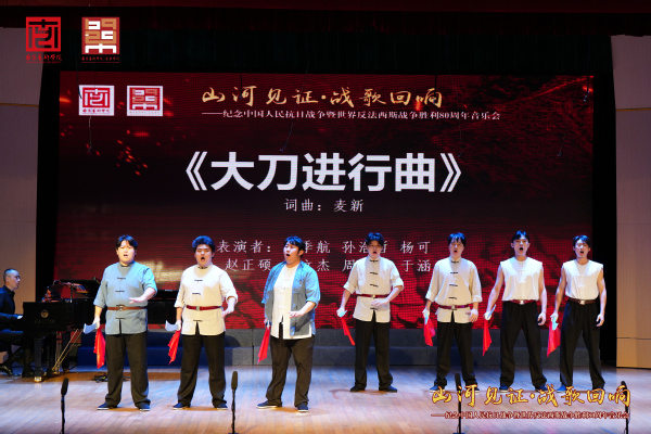 男声表演唱《游击队歌》以鼓点节奏勾勒出抗战期间游击队员的机敏形象。《地道战》的呼喊式旋律重现军民团结一心、英勇抗敌的智慧。《到敌人后方去》以号召力唤醒千万忠魂,镌刻人民战争的不屈印记。《大刀进行曲》以长城喜峰口战役为原型,“冲啊!杀!”的呐喊将情绪推向顶点,成为民族不屈的精神图腾。