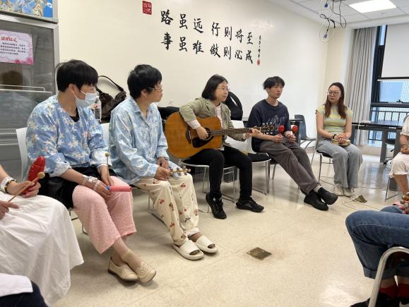 现场临床教学过程中,张一楠凭借深厚的专业功底与丰富经验,为在场师生和医护人员展示了音乐治疗的实践魅力。她依据患者病情差异,精心设计融入奥尔夫打击乐器的互动动作,引导员工从情绪状态、肢体运动、疼痛感受等多维度观察患者反应。同时,根据患者实时反馈,灵活调整音乐律动方式,确保治疗方案精准有效。此外,她还以舒缓的吉他弹唱形式,开展音乐引导想象,帮助患者放松身心,让在场师生直观感受到音乐治疗在临床实践中的独特魅力与作用。