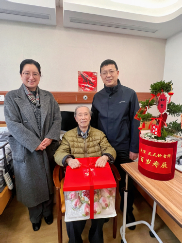 2025年12月24日下午,音乐公司党委书记王晓泉、副经理陈洁在办公室主任邱丹叶陪同下,专程前往银城君颐东方国际康养中心,代表学院向离休教师吴式铨贺寿,庆祝吴老百岁生辰,献上诚挚祝福。